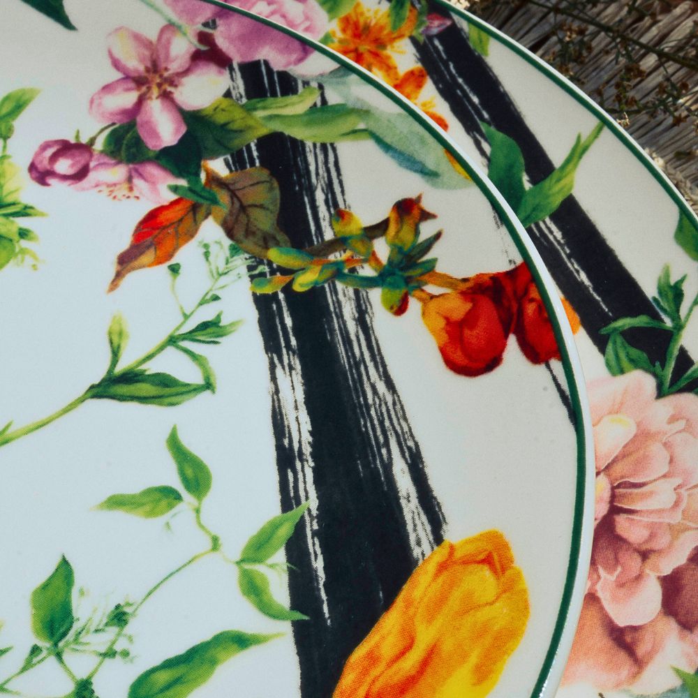 Ogni piatto è impreziosito da unafantasia floreale vivace e raffinata, con peonie, foglie e tralci colorati che sembrano dipinti a mano.