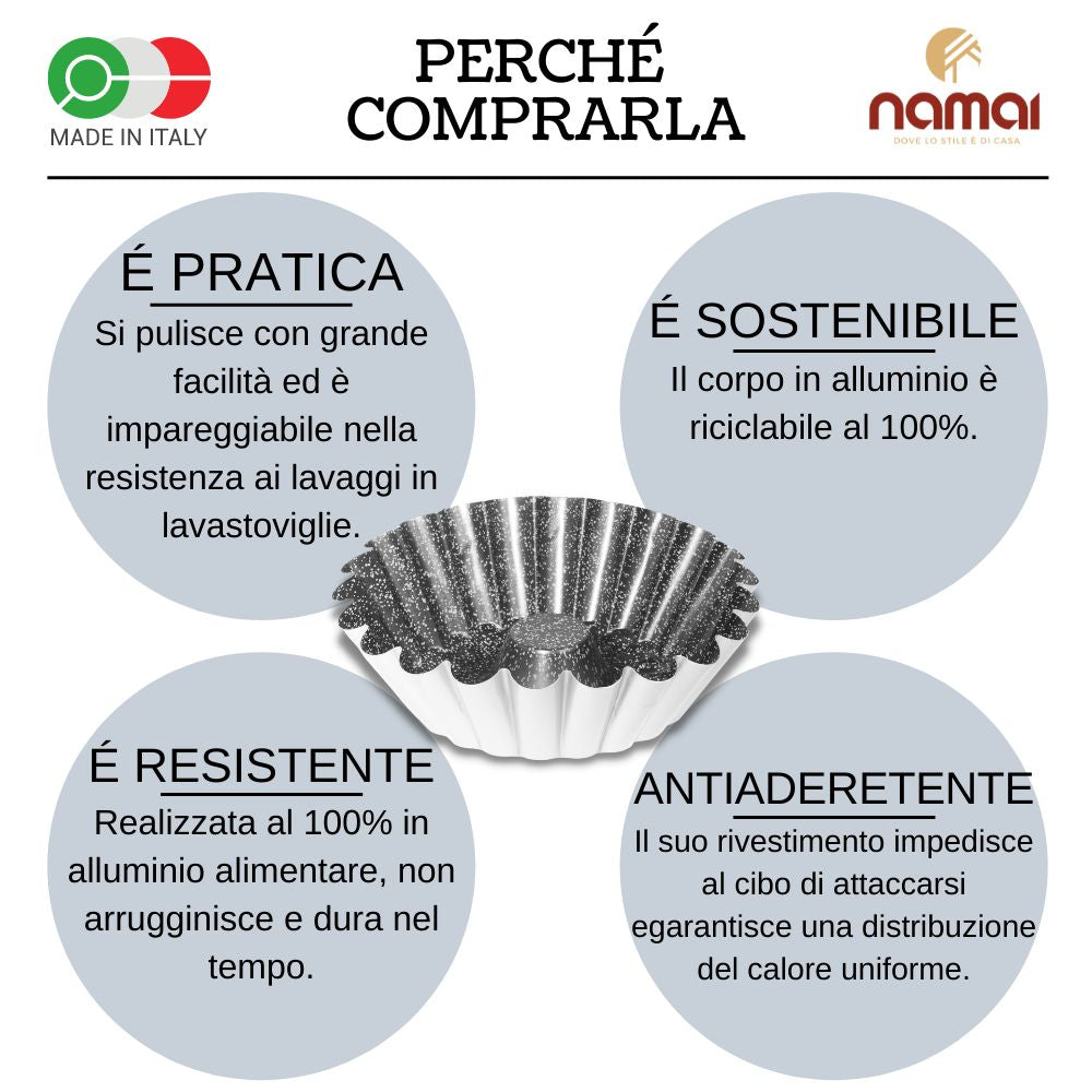 Realizzato con cura in Italia, ogni stampo NAMAI è un pezzo unico, frutto di lavorazioni artigianali che potrebbero presentare lievi difetti estetici, senza compromettere minimamente la funzionalità e le prestazioni del prodotto.