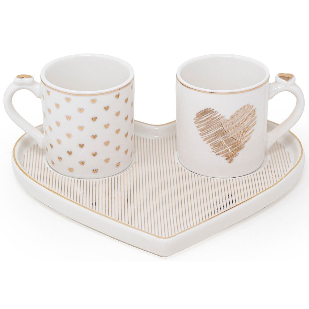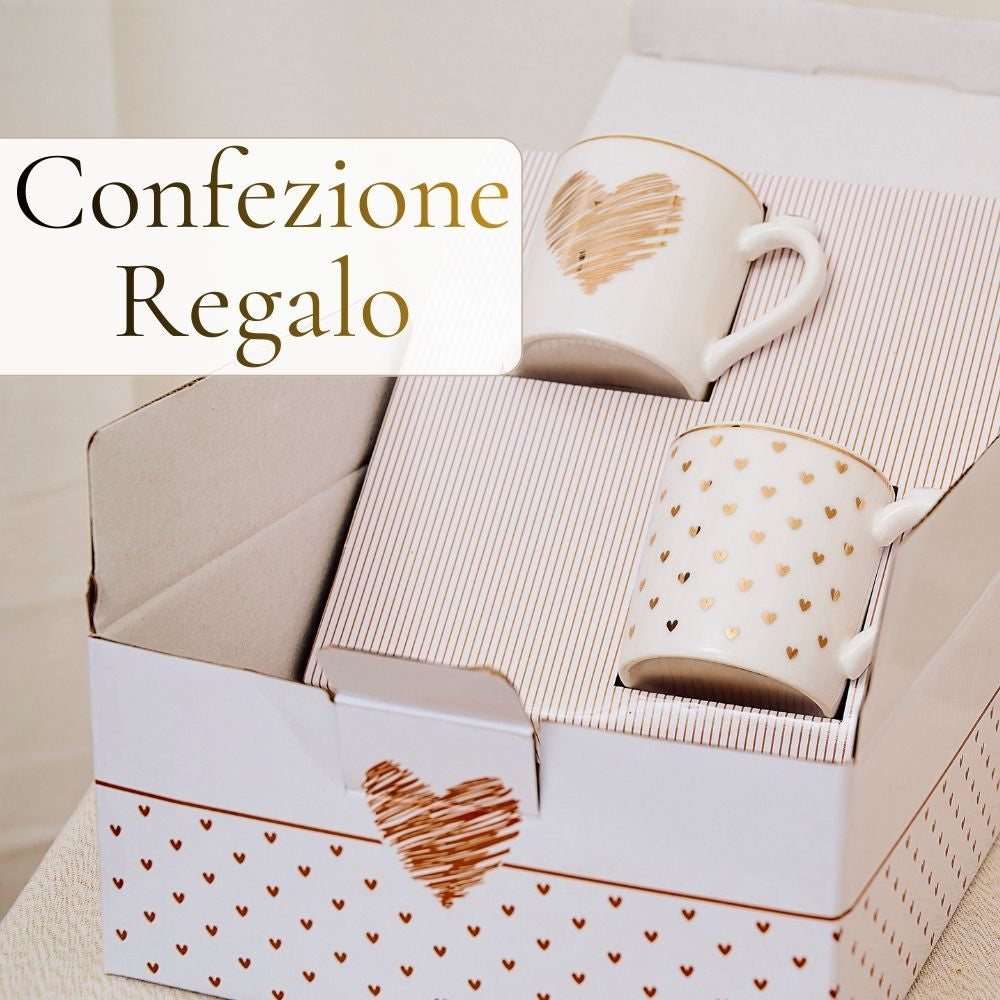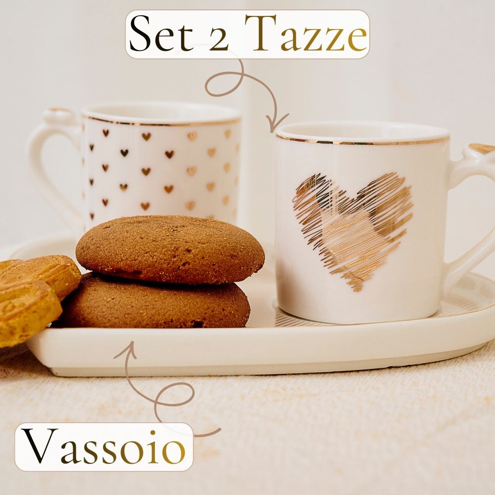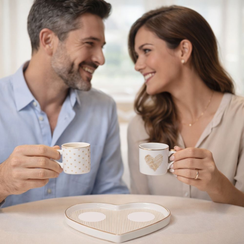 - Un Set Che Parla D’Amore – Due tazzine caffe raffinate e coordinate, accompagnate da un vassoio a forma di cuore, trasformano la semplice pausa caffè in un momento ricco di significato. Ogni dettaglio è pensato per celebrare la bellezza della condivisione, rendendo questo set ideale da vivere in coppia o con una persona speciale