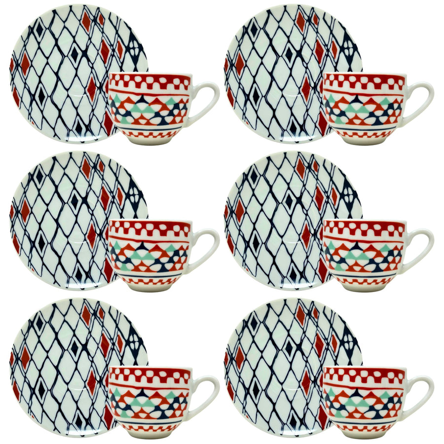 Design moderno e allegro: Le tazzine presentano un motivo geometrico con colori vivaci come rosso e blu, aggiungendo un tocco di energia alla tua tavola.